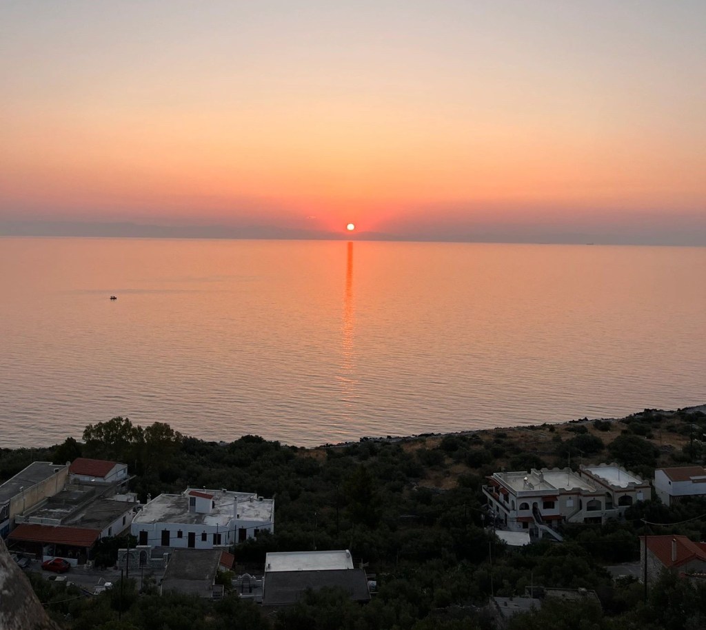 Estaba sumido en un sueño profundo, cuando noté una mano zarandeando mis hombros: se trataba de mi amigo Julio, despertándome. «Santi, Santi, el amanecer», repetía. Entreabrí los ojos y vi un colorido indescriptiblemente bello ─ uno de los márgenes de mi cama estaba orientado hacia la puerta y ventanas que daban al balcón, por lo que pude ver el horizonte nada más los abrí─. El cielo era naranja intenso, y el agua tomaba tonos rosados; en general, los colores naranja y rosa dominaban la paleta que adornaba la visión. El Sol aún se ocultaba tras el horizonte y, aun así, el cielo era un espectáculo exuberante. Se recortaba contra las aguas una umbría embarcación que salía a faenar. Era el único atisbo de vida humana, en un paisaje en el que sólo parecía existir el más puro esplendor de la naturaleza. Tras largos minutos de contemplación. el sol hizo su aparición; lucía radiante, amarillento, y sus rayos caían sobre el agua creando una fina estela rojiza. Tras deleitarnos en aquel espectáculo, que parecía una ensoñación— y lo consideraría tal si no hubiera pruebas gráficas de ello—, volvimos a dormir.