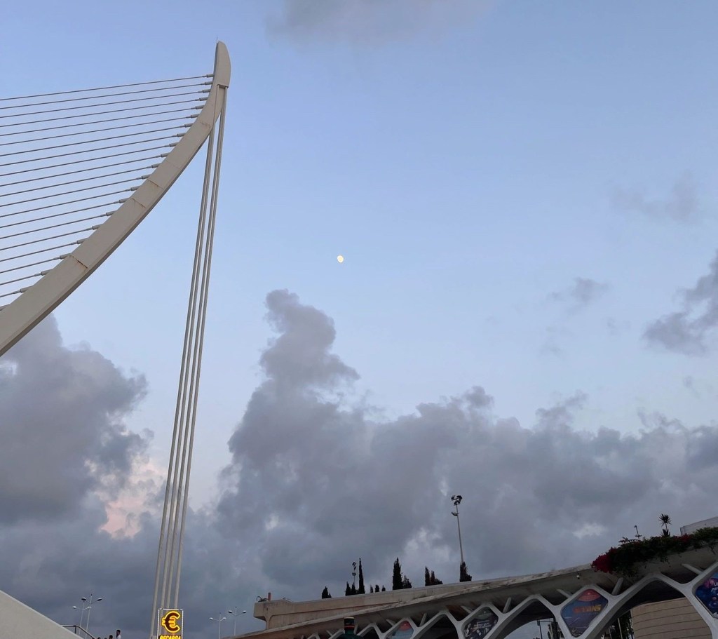 El festival tuvo lugar en la ciudad de las Artes y las Ciencias, concretamente en la explanada que resulta al vaciar el estanque que separa el Museo de las Ciencias y la discoteca de enfrente. Con unos alrededores así, que invitaban al disfrute y al goce estético, lo demás era sencillo. Aparcamos el coche en el paseo de la Alameda, separándonos sólo unos verdes jardines del complejo de edificios. Allí, empleándolo como campamento base, podíamos disfrutar de bebidas y charlas entre concierto y concierto, con un simple y rápido paseo para acceder al recinto. El sol se puso los dos días filtrando una luz exquisita en el Antiguo Turia. La Luna, gibosa creciente, sorprendía cuando uno le daba la espalda al escenario, hacia el suroeste.