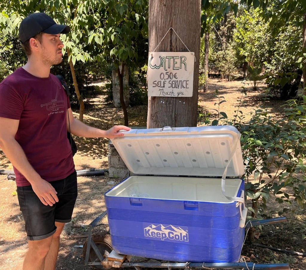Nos sentamos a almorzar al abrigo del sol, gracias a un puesto de comida que había a la salida. El almuerzo consistió en un hojaldre de queso feta y un capuccino. Volvimos finalmente al coche y emprendimos el camino de vuelta a Atenas en el que, naturalmente, me dormí.
