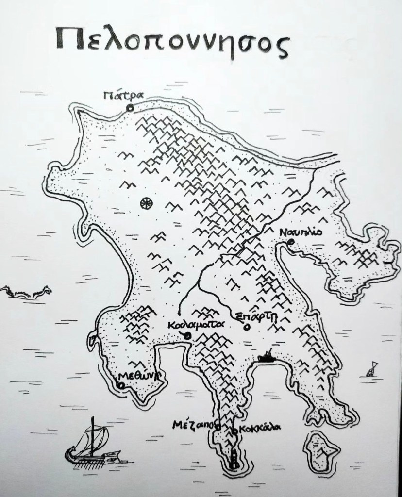 La mañana siguiente, nos despedimos de Kokkala, que era el único lugar donde habíamos descansado dos noches. Dejamos atrás Laconia y avanzamos hacia Mesenia, la región más occidental del Peloponeso. Si el paisaje de Ática era seco y yermo, el de Esparta verde y frondoso y el de Mani, árido y montañoso, Mesenia me sorprendió por lo exuberante de su naturaleza. Había montañas, pero éstas estaban lo suficientemente alejadas de la costa como para permitir llanuras donde abundaban los cultivos de regadío: olivos, naranjos y viñedos eran algunos de los ejemplares que se veían en las inmediaciones de Kalamata. Abundaban también las alquerías y los cortijos. El lugar me pareció una especie de calco helenizado de la huerta valenciana. Pasamos la mañana en la playa de Stoupa —cuyo nombre dio pie a hacer juegos de palabras con el nombre de cierto grupo de rumba catalana—, donde tuve la oportunidad de nadar y bucear nuevamente. Comimos boquerones, calamares y berenjenas en un restaurante cercano a la playa y, a modo de postre, disfrutamos de un suntuoso yogur griego y café.